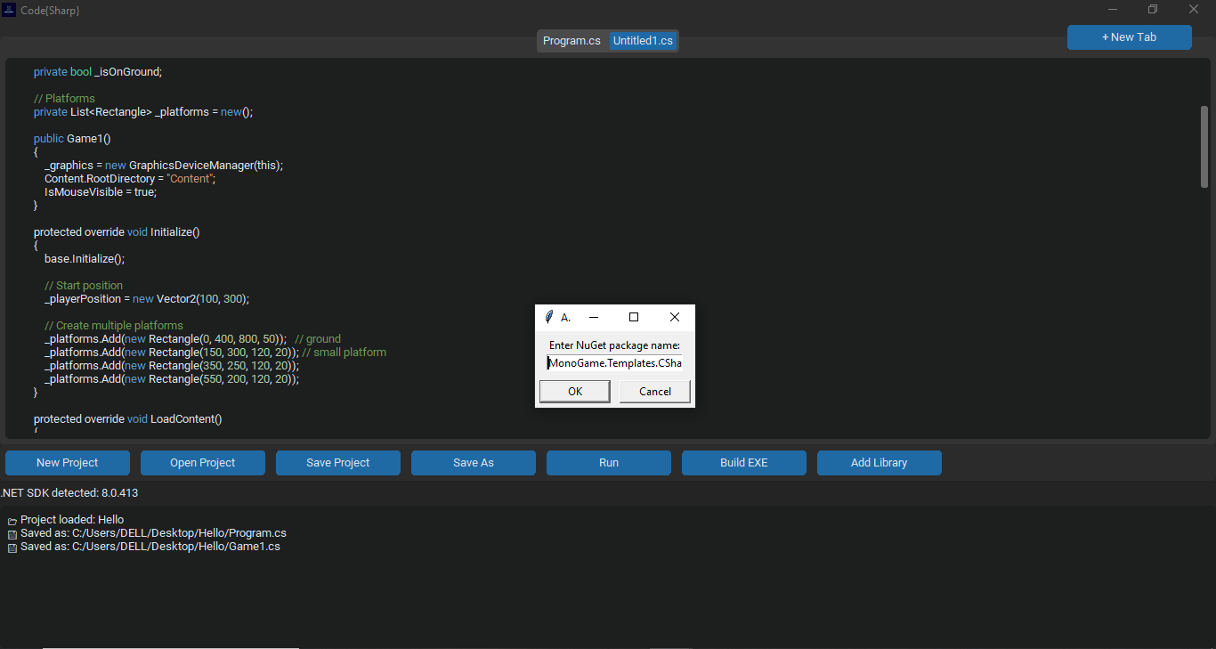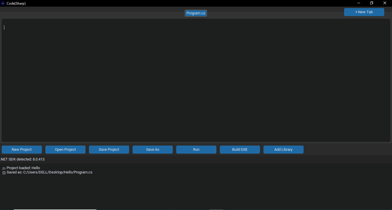 C# is very famous programming language but there are not too many C# IDEs. There are some but they are either very heavy, need high setup or are paid. Finding a perfect IDE is near to impossible. Code{Sharp} is an IDE that is lightweight and needs near to no setup, with no cost. It is very bigginer freindly and you will NOT need to do annoying tasks like making .csproj files , it is all automated. Adding library is a hard task in C#. You need to write many bash commands. In Code{Sharp}, you will need to just click on "ADD LIBRARY" button, enter name of the package like (Newtonsoft.Json) and Done!